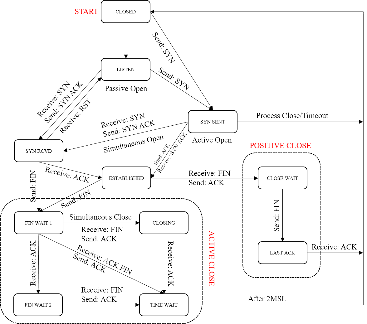 - 若想主动通信,发送 SYN 到 SYN SENT 状态。